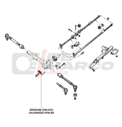 Importante: Si noti che questo non è un problema di parallelismo poiché le ruote sono effettivamente parallele fintanto che la velocità è costante.Spessori di regolazione zincatiL'altezza della scatola guida viene regolata tramite spessori inseriti tra la cremagliera e lo chassis. Questi spessori sono numerati da 1 a 7 e ogni spessore ha un preciso valore di dimensione. Questi spessori sono necessari per compensare il disallineamento dei supporti del cassonetto sui longheroni anteriori. I due spessori quindi non hanno necessariamente lo stesso numero e diametro.